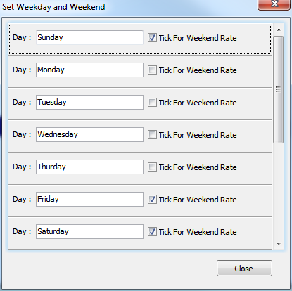Weekday and Weekend Weekday and Weekend Tick the days to charge weekend rates for. Copyright © 2012 Geni Software. All Rights Reserved.