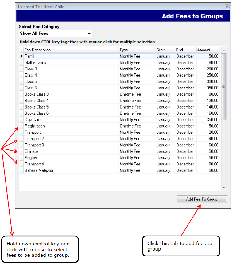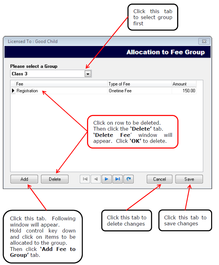 This 'Allocation to Fee Group' window is used to add fee categories to a group or delete fee categories from a group. Once defined, the selected fees will be applied to all the students belonging to this group.