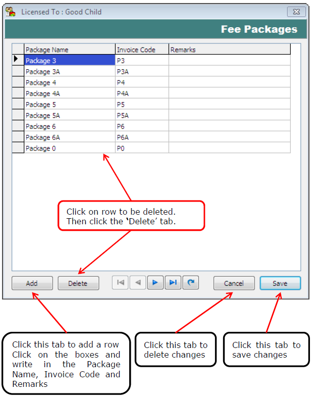 In this window the Fee Packages are named. Fee Packages assignment to a student is made at registration. Each package may have a predefined set of services lumped together. This makes it easy for a student to choose the desired packages.