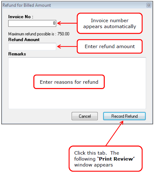 TUITION CENTER VERSIONOPERATION SETUP AND INSTRUCTIONS'Edit Invoice' Button - How to Open an Invoice Refund Process REFUND PROCESS FIRST open the 'Invoice Details' window SECOND on the 'Invoice Details' window click the 'Refund' tab The following 'Refund for Billed Amount' window appears