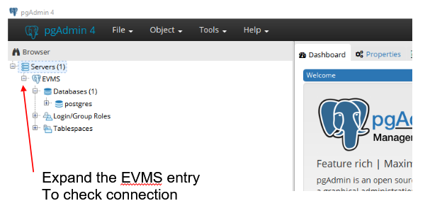 Now the pgAdmin software should be connected to the Database Server