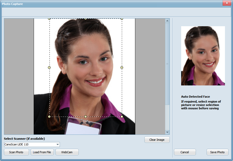 For manual entry of data you may use a photo stored on file, scan from a scanner or capture from a webcam. The software is capable of detecting faces and